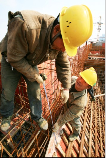 (圖為一體化生物反應池建設工地上工人們在7米多高的腳架上搭建混凝土澆筑夾板。)