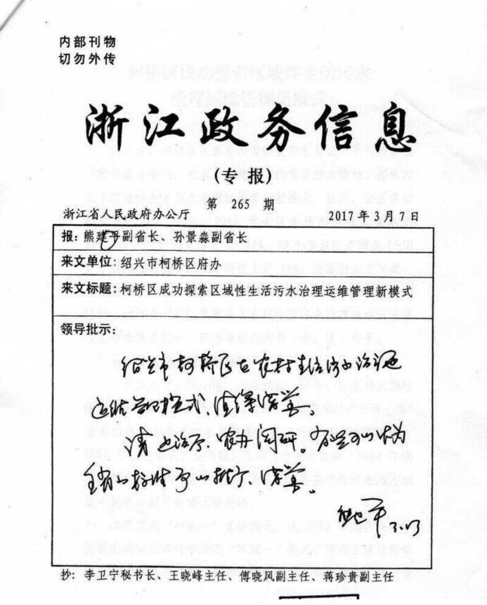 37日,浙江省副省長(zhǎng)熊建平對(duì)《柯橋區(qū)成功探索區(qū)域性生活污水治理運(yùn)維管理新模式》進(jìn)行批示,認(rèn)為柯橋區(qū)在城鄉(xiāng)生活污水治理運(yùn)維管理模式值得借鑒,部分經(jīng)驗(yàn)可以作為全省的標(biāo)準(zhǔn)予以推廣、借鑒。