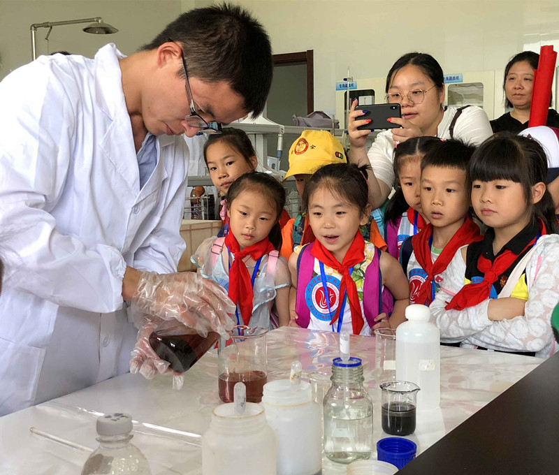 “經過三天三夜,混濁的污水就這般變得干凈了。現在,讓我們把這個時間縮短,來一次奇跡的見證。”實驗室里,學生們圍繞在實驗試劑的瓶瓶罐罐旁,平日里嚴謹的實驗技術人員瞬時變成了神奇的魔術師。“這就是我們平時未經處理的工業印染污水,只有通過一系列的污水處理環節,污水才能被排放至河流和大海中。”實驗室技術人員拿出用作處理污水的專業試劑,開始帶領學生做“污水絮凝沉淀”實驗。用膠頭滴管吸取試劑,使用玻璃棒攪拌、靜置,通過一系列的專業步驟,一杯杯污水慢慢地開始變清。“這就是絮凝沉淀實驗,通過加入‘混凝劑’,水中的污染物被不斷凝聚,最終沉淀至燒杯底部,從而使污水變清。”學生們一邊認真聽講一邊情不自禁“哇,水變清了!好神奇!”。