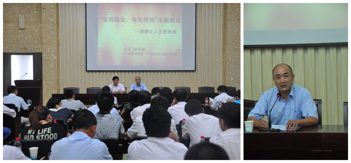 8月11日下午,公司邀請全國勞動模范、紹興市制水公司副總經理徐海根為公司班組長以上管理干部作題為《道德讓人生更美麗》的宣講教育,共80余人聆聽了模范的精彩宣講。會上,徐海根結合自身工作實際,用樸實的語言從職業道德、責任心、愛崗敬業等方面講述親身經歷的感人故事,感人至深,催人奮進。與會的每個人在這里接受了一次心靈的洗禮,取得較好的效果。