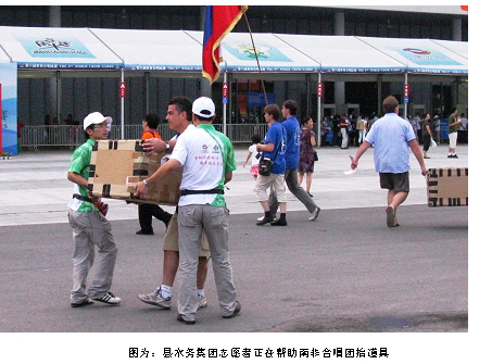 檢票口通道處突然出現個頭頂大箱的外國人,看他很吃力的樣子,隊員主動向前提供幫助,經過一番的交流,得知該團隊是來自南非的合唱團,搬大箱子的是該團的指揮,里面裝著的是南非民族樂器打鼓,是今天晚上表演的道具,隊員們將沉甸甸的大箱打鼓搬運到了舞臺幕后。