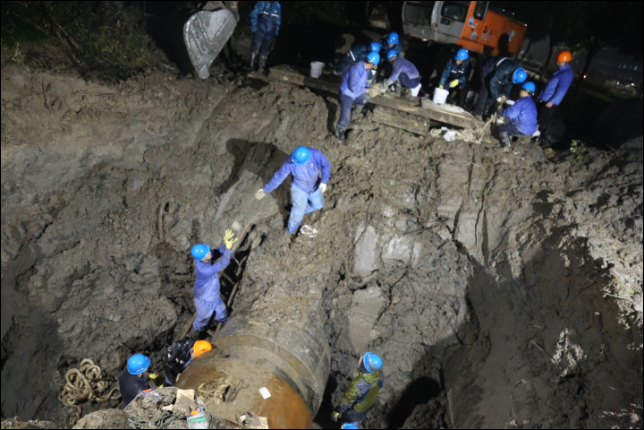 1月17日晚,紹興柯橋?yàn)I海供水公司搶修人員在寒夜中冒雨搶修D(zhuǎn)N1000一期原水管。據(jù)了解,該管線位于興濱路與越北路交叉口以南,是公司輸送原水的重要管線,公司根據(jù)工業(yè)區(qū)供水情況,在不影響企業(yè)用水的前提下展開搶修工作,經(jīng)過開挖、電焊等工序,連續(xù)工作12小時后,直至晚上9點(diǎn)原水管搶修完成。